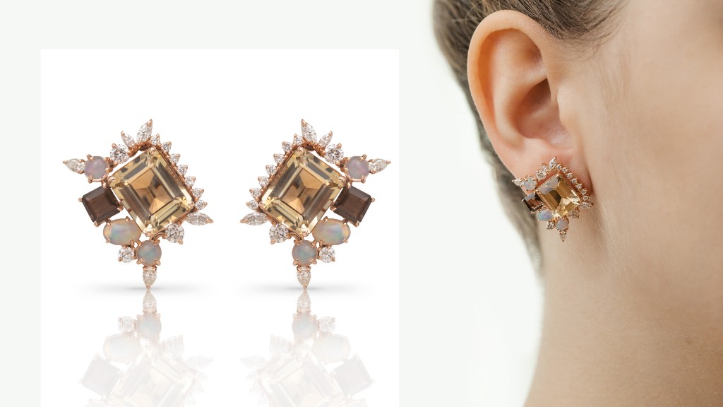 O Brinco FV nasceu da transformação de um lote de citrinos e quartzos fumês, guardados por anos. Em vez de criar algo totalmente novo, a escolha foi resgatar essas gemas e trazê-las de volta ao protagonismo, redesenhando-as em uma nova composição.