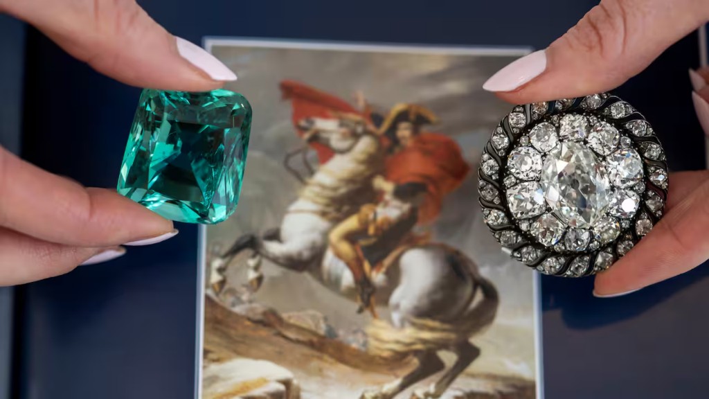 Um broche histórico com diamante oval de 13,04 quilates, usado por Napoleão Bonaparte em ocasiões especiais, foi um dos grandes destaques do leilão Royal & Noble Jewels, realizado pela Sotheby’s em Genebra.